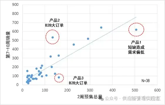 预售持续6周,第7周开始正常销售。直觉告诉我们,预售期间卖得好的产品,正常销售一般也卖得好。由于供应周期较长,案例企业在预售进行了2周时,就得预测预售结束后的需求,以便及时驱动供应链来响应。这里我们首先要验证的是,2周的预售销量和正常销售期的需求之间,是否也存在线性比例关系。