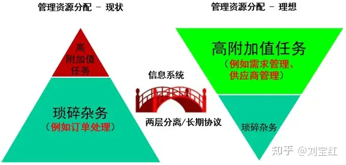 如图,左边的正三角是大部分公司的现状:采购的大多精力花在琐碎杂务上,比如下单、跟单、追料、验货、付款等,经常性地处于救火状态,按下葫芦起了瓢,结果是挤占了高附加值任务的时间,导致重要但不紧急的事没法及时完成。这些重要但不紧急的事,例如供应商选择与总体绩效管理,处理不到位,就就导致更多订单层面的问题,形成恶性循环,结果是整个采购组织深陷日常运作的泥淖。