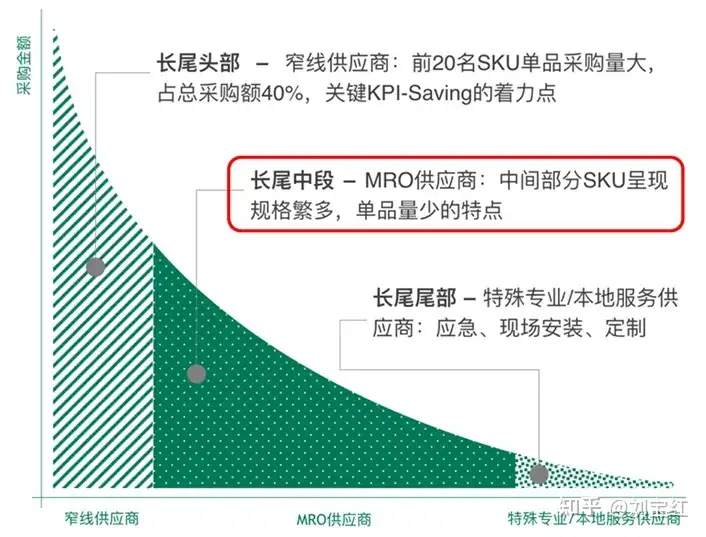 一提到MRO,大家就联想到长尾。但长尾还可细分,就如图2所示,长尾头部的单品采购量大,采购金额高,对企业的影响大,是采购节支的重要对象,可由企业自己来采购。长尾的中段呢,对企业来说是典型的量小货杂,但对MRO供应商来说则否。后者聚合多个客户的需求,形成规模效益,对企业来说是"收口子"的理想对象。把MRO供应商选好、管好,对企业的总成本往往更低。