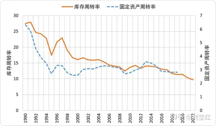比如丰田汽车适度建立关键芯片的库存(放在供应商那里),适度参股重资产(比如控股日本的MPU芯片公司),都是在优化just in time的精益做法,由原来精益至上,变得更加平衡,通过适度冗余来更好应对业务多元化、全球化过程中的供应链中断风险。但代价是加剧了库存周转率的持续走低,固定资产周转也呈现类似趋势(如图)。