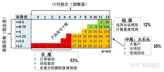 对于中尾产品,图 1中的示例定义为12月频次高于等于6,但离散系数大于0.75。中尾产品的需求之所以频繁但不稳定,往往是因为有显著改变需求的事情在发生,比如促销、活动等"大石头",要么是企业自己驱动,要么是客户、竞争对手驱动的。我们的应对方案就是基于数据模型,制定基准预测(往往需要数据清洗),然后结合销售、市场、产品等的判断,"从数据开始,由判断结束",来制定需求预测。