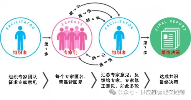 首先是由组织者来组建专家团队,提供项目背景信息,告诉专家们决策的目标。然后让专家们背靠背、独立做判断,并简单附上判断依据。接下来组织者会整理汇总,以匿名的方式反馈给全体专家,让信息变对称,成为下一轮判断的基础。