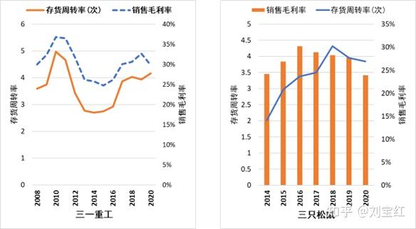 库存周转越高,企业的毛利也越高。有段时间,我正好在服务三一重工和三只松鼠,前者是制造业的代表,后者是电商行业的佼佼者,就整理它们的财务数据,来展示库存周转和毛利的关系。我们能清楚地看到库存周转和毛利高度相关。这也符合常识:企业运作效率越高,库存周转就越快,整体运营成本也越低,毛利也就越高。