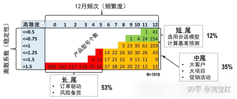 比如表格的最右上角是41,意味着有41个产品型号的12月频次为12,需求的离散度不超过0.5。相应地,表格最左下角的505,意味着有505个产品型号在过去12个月没需求,需求离散度大于1.5等。