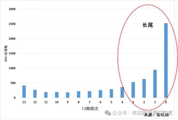 如图1,这是某电商在前置库位的13周频次图。其中有2500多个SKU的13周频次为零,表明这些产品在过去13周内没有一周有需求,是典型的长尾;400多个SKU的13周频次为13,表明这些产品在过去的13周里,每周都有需求,更可能是短尾或中尾。